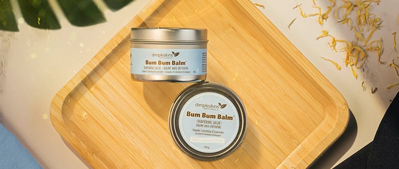 Jen laughs as she talks about how she constantly hears from moms wondering if their baby will be okay after eating a whole container of one of Dimpleskins Naturals products. She tells them not to worry. “Everything is edible. I had to make sure if the baby ate it, nothing was going to happen.” All her products are in balm form as opposed to a more liquidy lotion because it offers a longer shelf life and a safer product. Once you add water to a product, bacteria can grow quickly, meaning you must use a synthetic preservative. Jen formulates her products with essential oils, beeswax, and coconut oil, which have anti-fungal and anti-bacterial properties. She also favours tea tree oil, lavender, geranium, calendula for their soothing and healing properties.